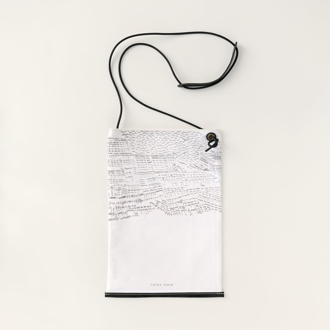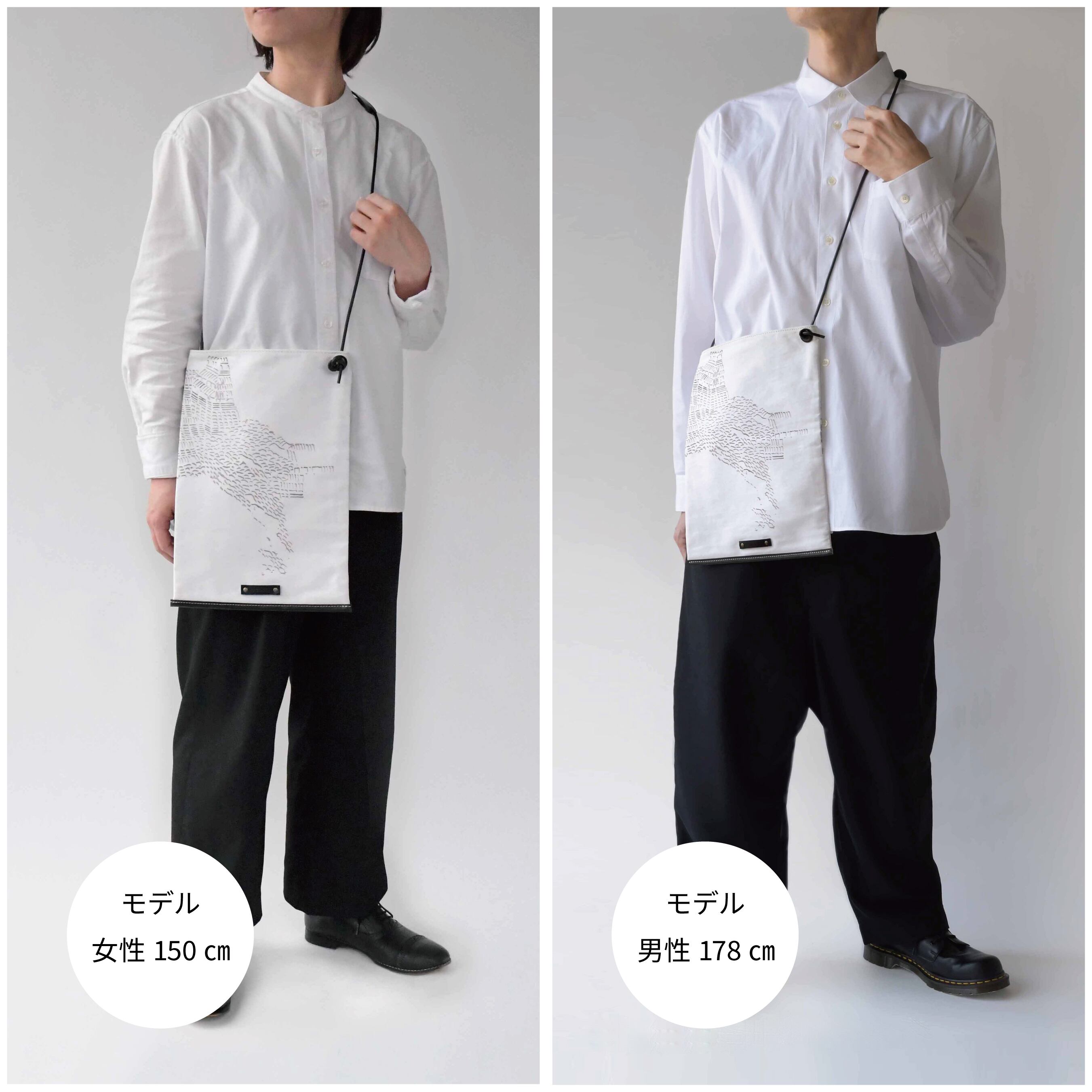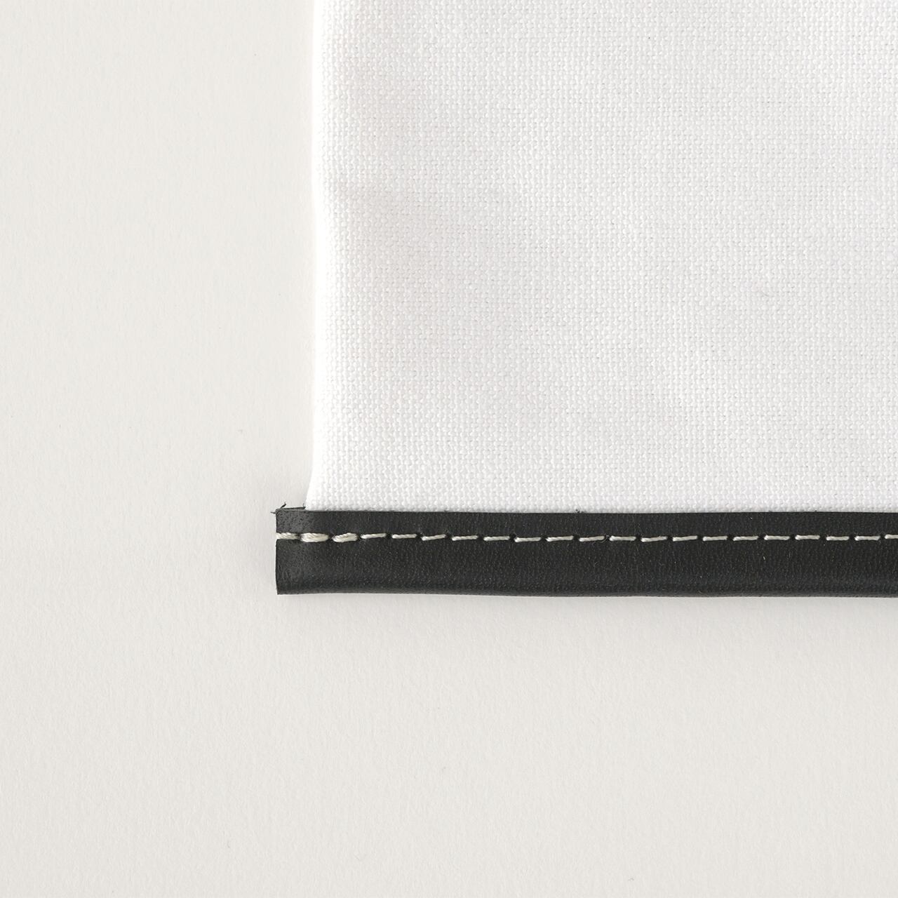 陰影のある町並みが表から裏へ地続きにゆったりと広がるデザイン。白を基調とした生地に黒い革がアクセントになります。