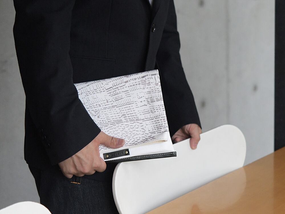 A4サイズも入る、縦長のスッキリしたシルエットと、長さを自由に調節できる革紐。ショルダーバッグやトートバッグ、ラフにたたんで片手でかかえたり、お出かけや仕事などさまざまなシーンにアレンジいただけます。工房の職人さんによって仕立てられた革のパーツが、上品なアクセントに。